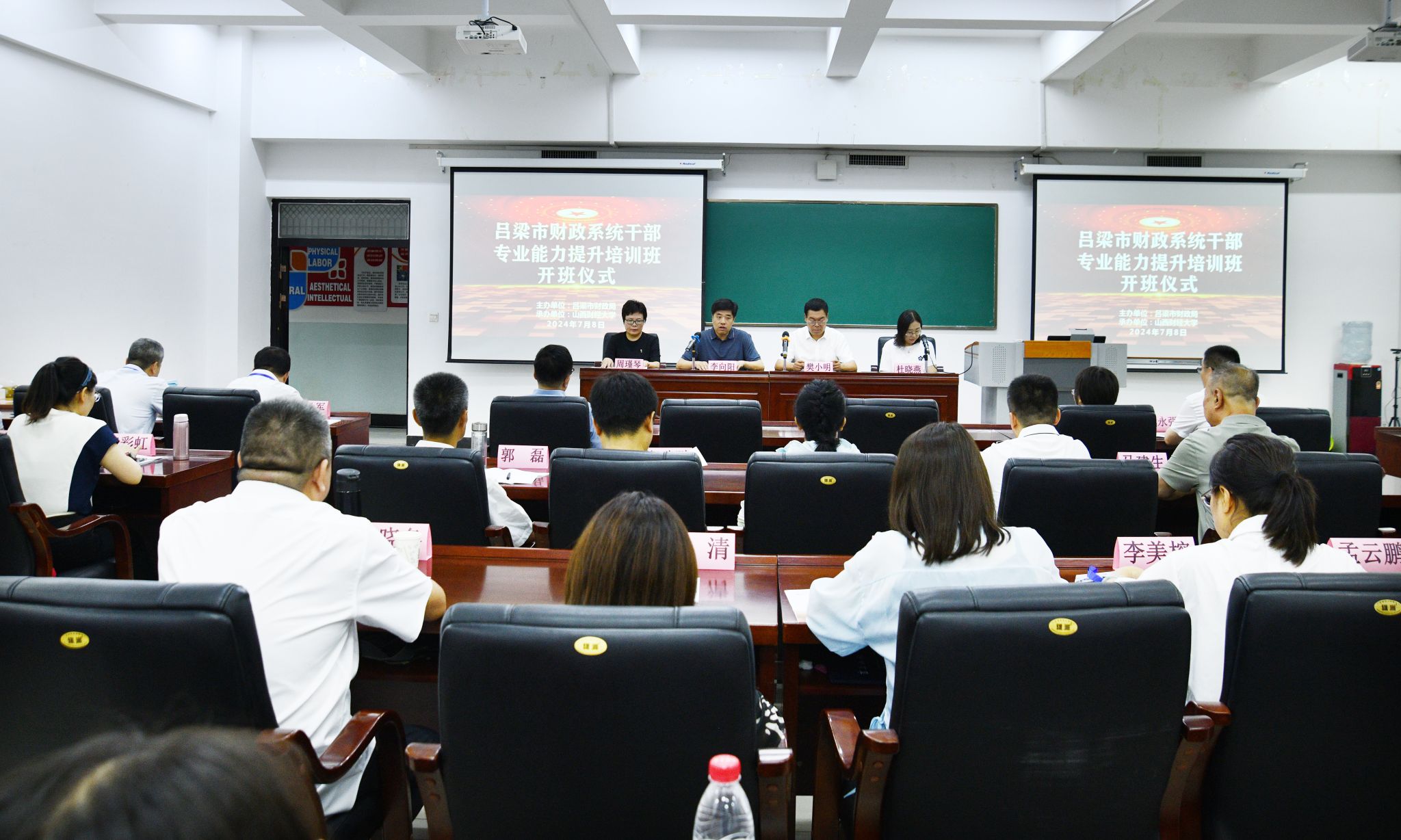 在全党深入开展党纪学习教育、全国加快发展新质生产力之际,吕梁市财政局在我校举办吕梁市财政系统干部专业能力提升培训班,7月8日培训班在我校举行开班仪式,吕梁市财政局党组书记局长樊小明,吕梁市财政局党组成员、市纪委监委驻市财政局纪检监察组组长杜晓燕,tyc8722太阳集团党委书记、院长李向阳出席开班仪式,吕梁市财政系统干部约90人参加学习。开班仪式由tyc8722太阳集团党委副书记周瑾琴主持。
